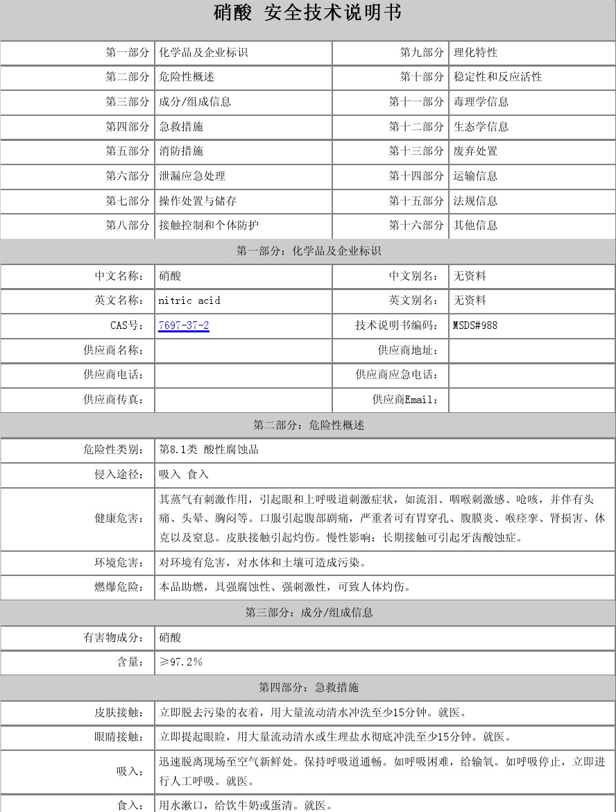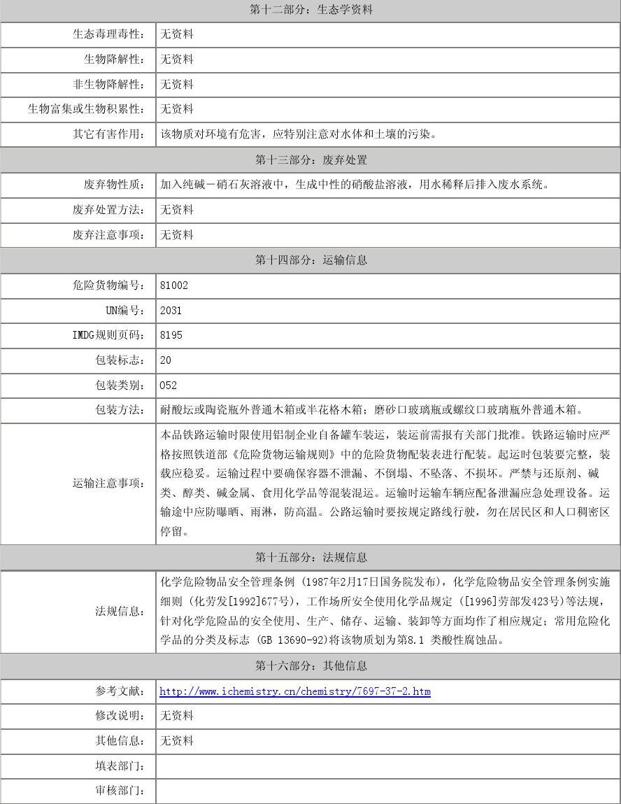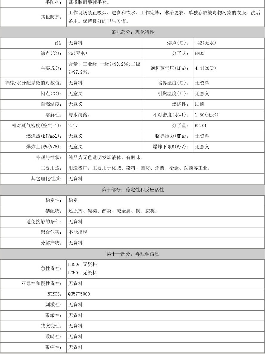 【物理性質(zhì)】純硝酸為無(wú)色透明液體,濃硝酸為淡黃色液體(溶有二氧化氮),正常情況下為無(wú)色透明液體。有窒息性刺激氣味。濃硝酸含量為68%左右,易揮發(fā),在空氣中產(chǎn)生白霧,是硝酸蒸汽與水蒸汽結(jié)合而形成的硝酸小液滴
